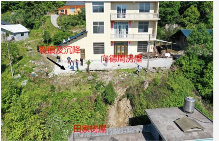 廖家坝村六组田家树的房子修建在一处山坡之下,山坡顶端为一处地坪。工作队在日常走访中发现,该处地坪出现了一处约3米长的裂痕,靠外侧的部分已经发生了约10cm的沉降。田家树一家对居住安全很是担心。“每逢下雨天,在家里都提心吊胆的,一有风吹草动,就赶紧往外跑,就是怕屋后哪天就滑坡了。”田家树说。