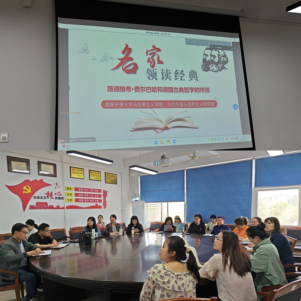 (通讯员:夏文婷)2023年4月11日,由国家开放大学主办的“名家领读经典”活动在五棵松校区正式开讲。本场活动有幸邀请到了国家开放大学思政课教学指导委员会主任委员、特聘教授王怀超授课。此次领读聚焦恩格斯经典著作——《路德维希·费尔巴哈和德国古典哲学的终结》。学院思政课教师、全体行政人员通过腾讯会议的方式参加了此次集中学习。