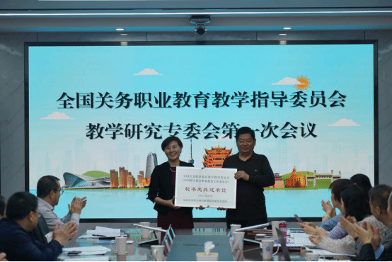 全国关务职业教育教学指导委员会副主任委员兼秘书长郑俊田教授代表行指委讲话,对专委会课程标准制定工作提出要求,并向我校授予“全国关务职业教育教学指导委员会秘书处共建单位”牌匾。