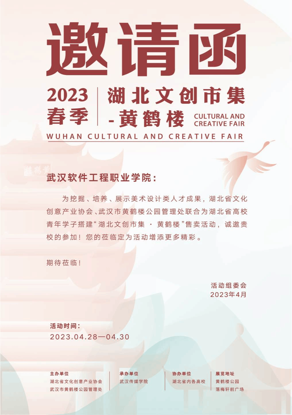 4月28日9:30分,黄鹤楼公园落梅轩内,以“黄鹤楼”为主题的文创产品火爆开市。艺术与传媒学院学生作品获邀参加,本次活动由湖北省文化创意产业协会、武汉市黄鹤楼公园管理处主办,武汉传媒学院承办,湖北省内各高校协办,在黄鹤楼公园落梅轩前公园展览。现场熙熙攘攘、热闹非凡。