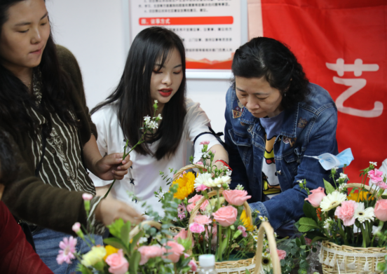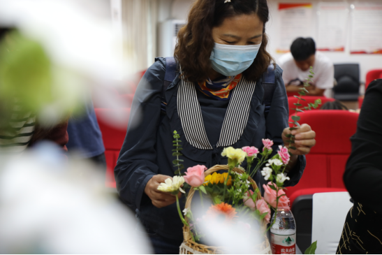 艺术与传媒学院选派经验丰富的教师王婷为社区居民讲授插花艺术,她从插花艺术的基本知识、造型设计、色彩搭配等方面教授相关技艺。居民们看到王老师完成的精美作品后,频频点头称赞,大家更是兴致盎然、跃跃欲试。在王老师的指导下,居民们动手修剪、整枝、去叶、弯曲、塑形,将普通的花草变成了生机盎然的作品,欣赏着自己的劳动成果,露出幸福感十足的笑容。