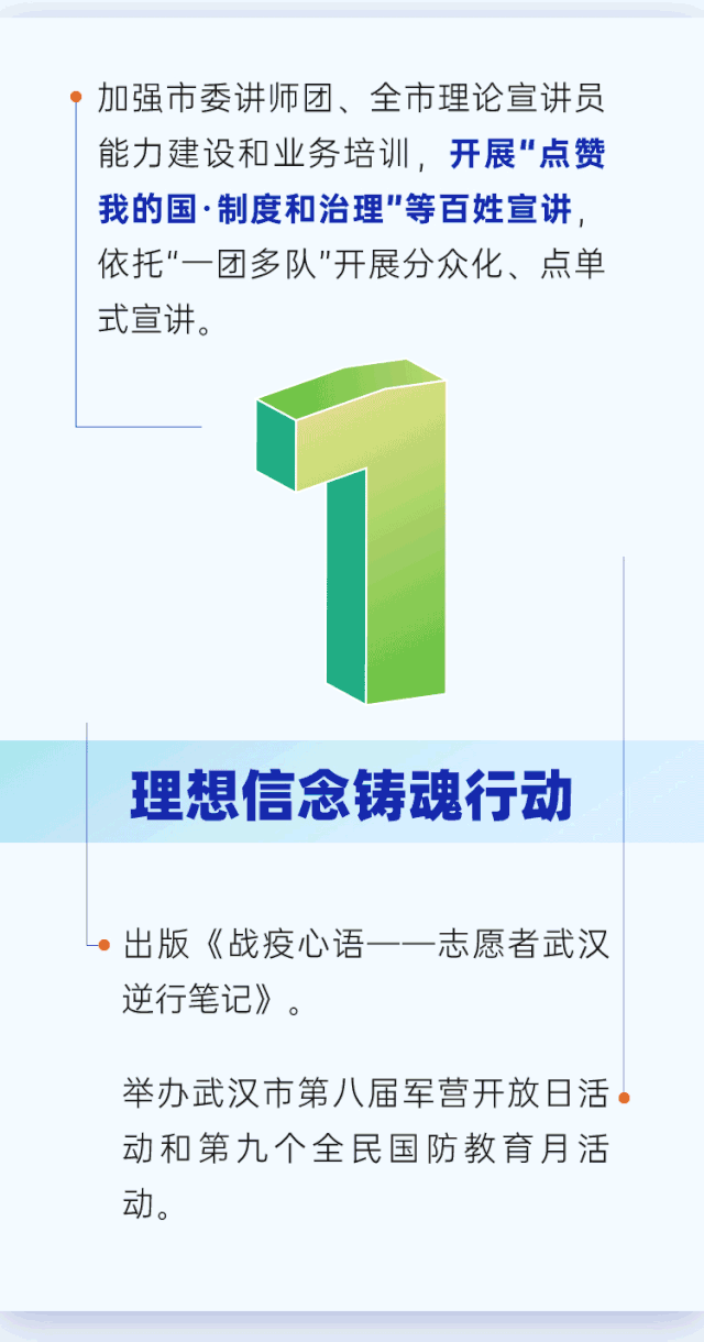 理想信念铸魂行动、市民素质提升行动、健康生活倡导行动、社区治理提质行动、城市环境美颜行动、窗口行业创优行动、志愿服务关爱行动、红色文化育人行动、立德树人推进行动、文明乡风涵育行动。