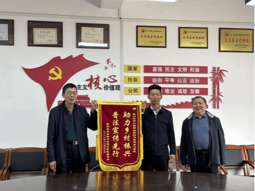 (通讯员:叶玉姝)3月8日上午,新洲区凤凰镇刘湾村村委会主任周德平、校驻村工作队一行来到我校,向马克思主义学院赠送了一面印有“普法宣传先行 助力乡村振兴”的红色锦旗,以感谢学院对刘湾村普法宣传工作的志愿帮扶。
