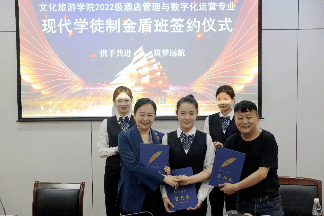 (通讯员:王玉娟)6月5日,我校与国家级文明旅游示范单位、武汉光谷金盾酒店有限公司举行签约仪式,为文旅学院酒店管理与数字化运营专业“现代学徒制试点班”开班。双方签署合作协议、校企生三方协议,就产教融合、校企合作进行了深入交流。我校向订单班企业导师颁发聘书。