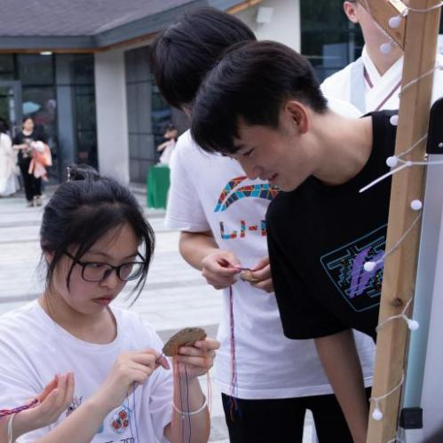 佩香囊、编彩绳、绘团扇是我国的传统风俗和工艺。电子学院、汽车学院、商学院的工作人员带领现场师生一起穿针引线,手持画笔。不一会儿,一个个饱满芳香的小小香囊,一根根色彩鲜艳的五彩手绳,一个个生动鲜明的精致团扇就做好了。“七彩丝线缠香囊,祝福裹满暖心房”,大家欢声笑语,其乐融融,互相赠送,以寄祝福。