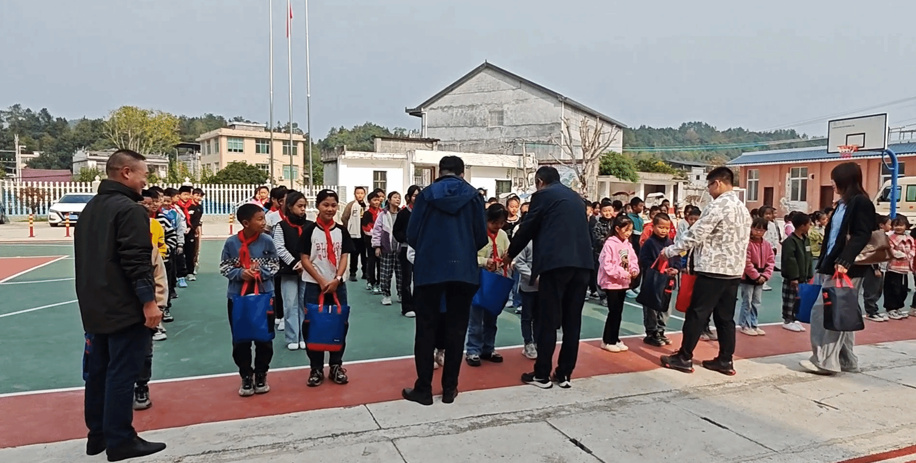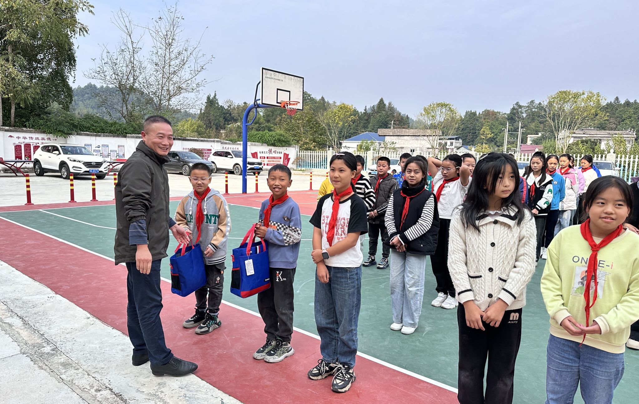 在深秋的暖阳中,老师们带着精心准备的丰富的学习用品和满满的爱心,为这里的孩子们送上了一份特别的关爱。马克思主义学院党总支书记张国华、院长罗可成以及多位思政课教师将书包、笔记本、签字笔、跳绳、黏土等学习用品送到孩子们手中。接过崭新的书包和学习用品,孩子们脸上洋溢着幸福的笑容。这份来自远方的关爱不仅承载着学校对乡村学子的深情厚意,更是对他们未来成长的鼓励和支持。
