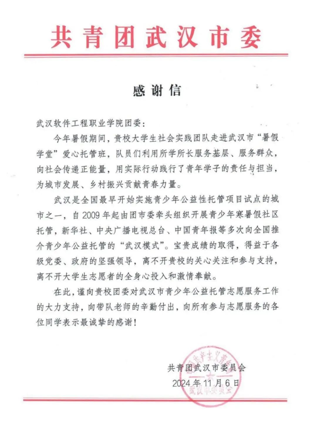 他们的辛勤付出,赢得了团市委领导的关注和认可,11月14日,团市委副书记吴海东一行来我校调研暑期社会实践工作情况并送来感谢信。吴海东对学校社会实践团队和团干们寄予厚望,希望学校继续参与武汉各区假期托管工作,结合专业加强青少年科普教育,为中国式现代化武汉实践贡献谱写新篇章。