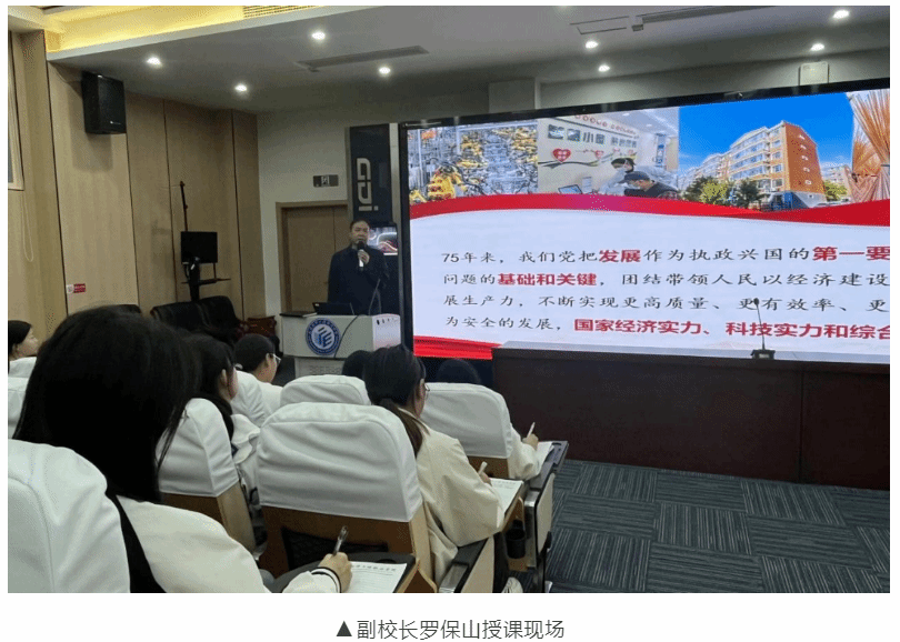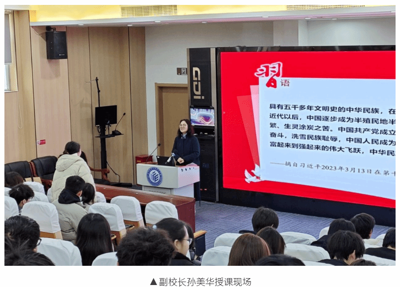 (通讯员 夏文婷)为贯彻习近平新时代中国特色社会主义思想,落实立德树人根本任务,本学期第10至17教学周,校领导班子成员孙美华、王中林、徐良益、罗保山纷纷走进课堂,以《七十五载迎盛世 砥砺前行续华章》《改革的实践续篇 现代化的时代新篇》等为主题,为2023级学生带来了一堂堂生动而深刻的“形势与政策”课。