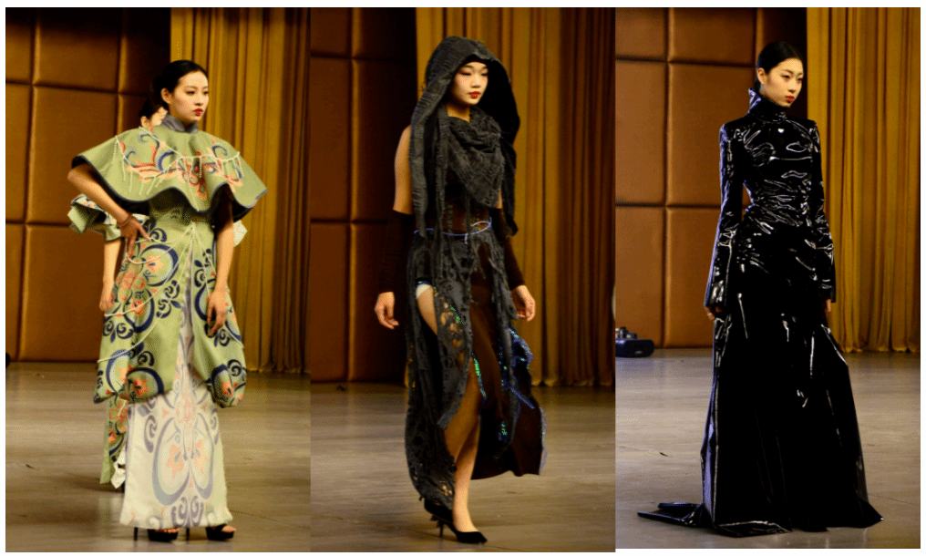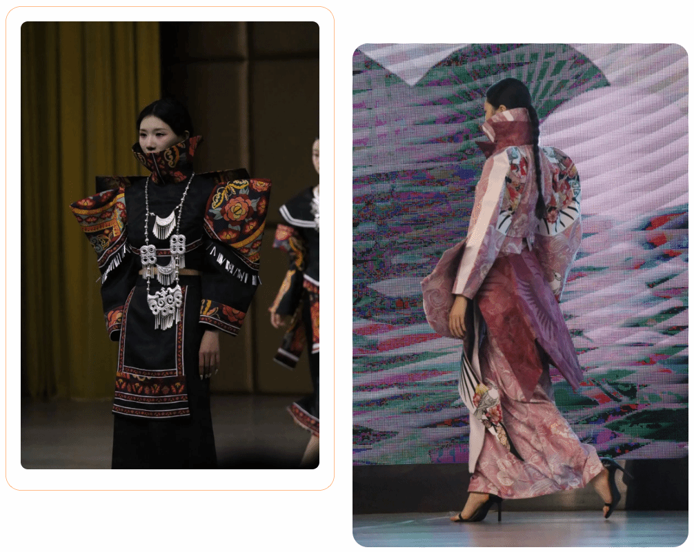 本次时装秀以“智织霓裳”为主题,展示了2022级毕业生的心血结晶。作品融合了传统与现代,匠心与科技,凭借质感面料与精巧剪裁讲述时尚故事的成衣秀,借助数字化技术突破传统边界的前沿 3D 服装虚拟展示,仿佛编织出如梦似幻的霓裳羽衣。其中,《彝韵新颂》系列服装设计汲取了四川凉山彝族文化灵感,传统元素与现代设计的碰撞,展现了彝族服饰的神秘魅力;《清·墨》系列设计深耕新中式美学,探索非遗文化的现代演绎,展现金陵折扇的历史、技艺与艺术特色。这些作品不仅展示了学生的创意与技艺,也是传统与现代的完美交融。