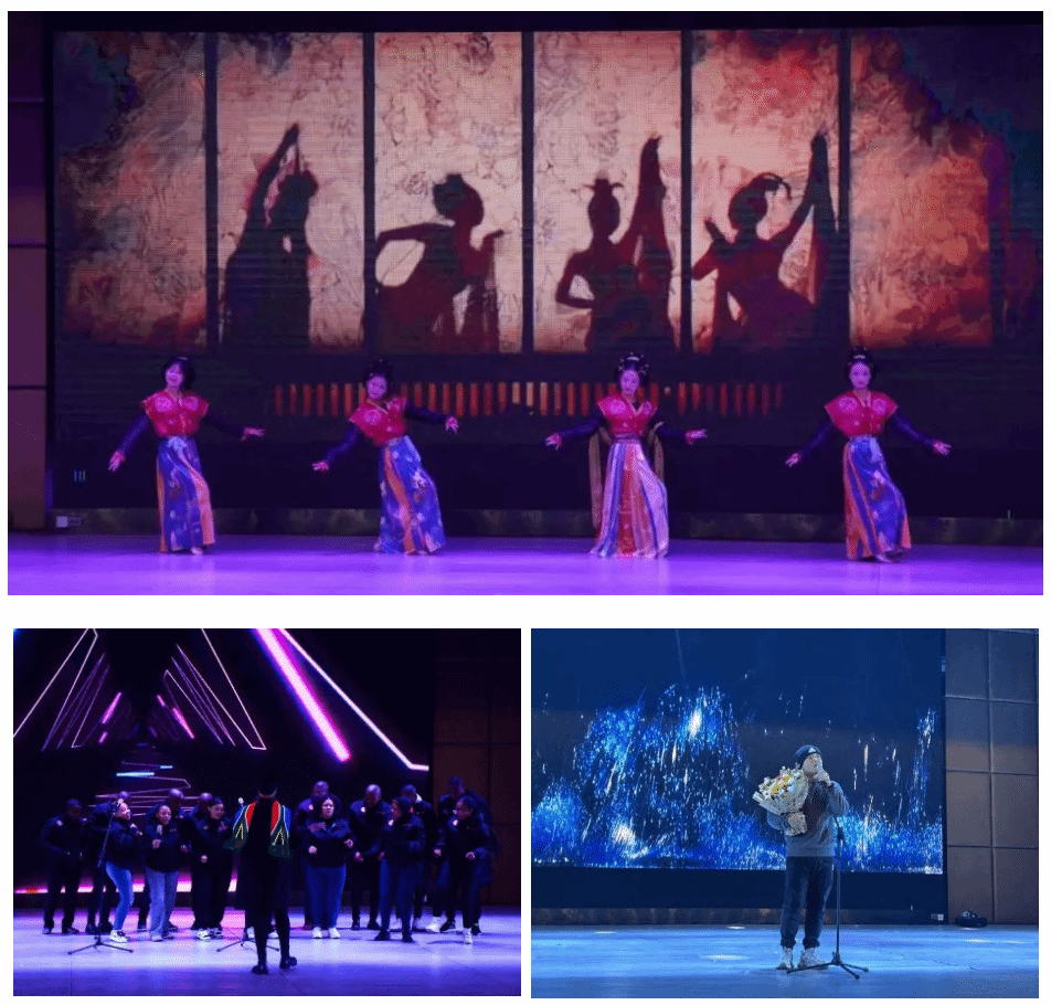 毕业设计动态秀的圆满落幕,元旦晚会正式拉开帷幕。晚会分为“以艺弘德以美润心”、“以艺践学以美启智”、“以艺载道以美赋能”三个篇章,为观众呈现了一场精彩纷呈的艺术盛宴。