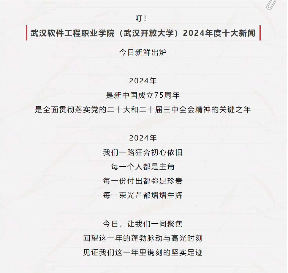 1月20日,中共武汉市委机构编制委员会印发《关于武汉市交通学校并入武汉软件工程职业学院的通知》。11月15日,问津校区建设项目推进顺利。今年以来,在省教育厅和市委、市政府的大力支持下,学校坚持干字当头、以干促上,以办学能力高水平、产教融合高质量为统领,全力推进高质量发展各项任务。