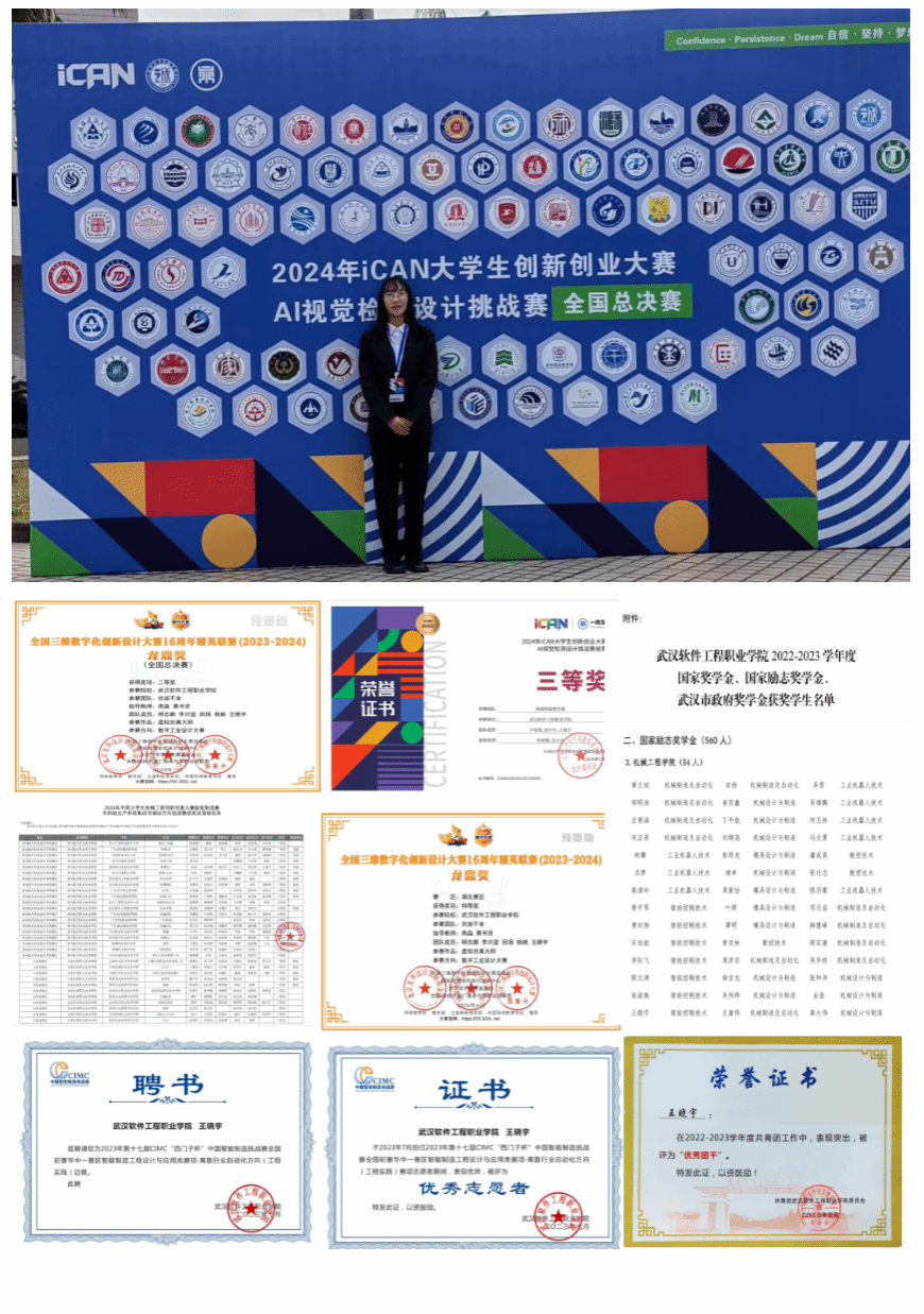王晓宇同学对智能控制技术领域充满热情,她刻苦钻研专业知识,在大二这一学年成绩平均分高达92.8分,展现出她的勤学奋进。她还积极参与学科竞赛,勇于挑战自我,不断拓展知识边界。她在iCAN大学生创新创业大赛AI视觉检测设计挑战赛中荣获全国总决赛三等奖,并在全国三维数字化创新设计大赛中多次获奖,展现了她在智能控制技术领域的专业素养和实践能力。