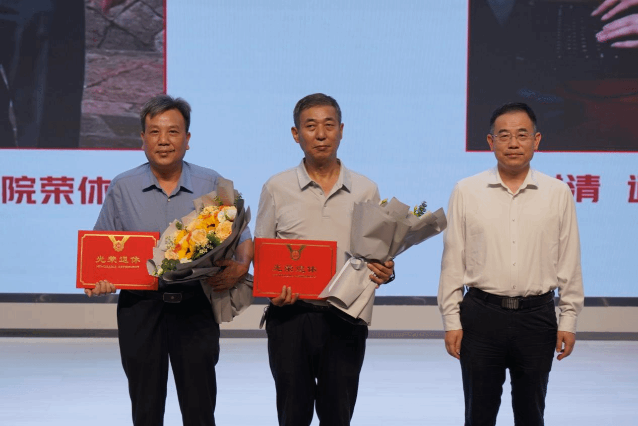 会上还举行了2024-2025年度教师荣休仪式。学生代表为退休教师代表廖传林、杨树清老师献上鲜花,校党委书记蒋兴鹏为他们颁发荣休证书。