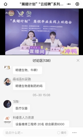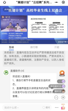 这是我校今年以线上直播形式举办的第二场招聘活动,此次活动得到团市委、市人社局、武汉青年创业中心、武汉市人才服务中心和武汉锦绣人才管理顾问有限公司等的大力支持。武汉京东方光电科技有限公司、武汉明德生物科技股份有限公司、菜鸟网络科技有限公司等6家知名企业,带来200余个专业对口岗位,企业人力资源主管轮流上台,通过企业宣传片帮助学生了解企业概况,借助幻灯片进行招聘宣讲,介绍招聘需求、岗位职责、任职要求和薪酬待遇等,吸引计算机网络技术、工业机器人技术、物流管理、模具设计与制造、影视动画等多个专业毕业生投递简历。活动当天,上千名毕业生在线观看,直播间咨询人数达百人次,评论区互动热烈,主播将学生的诉求及时转达企业,企业即时解答,形成良好的互动循环,弹幕点赞超两千次。
