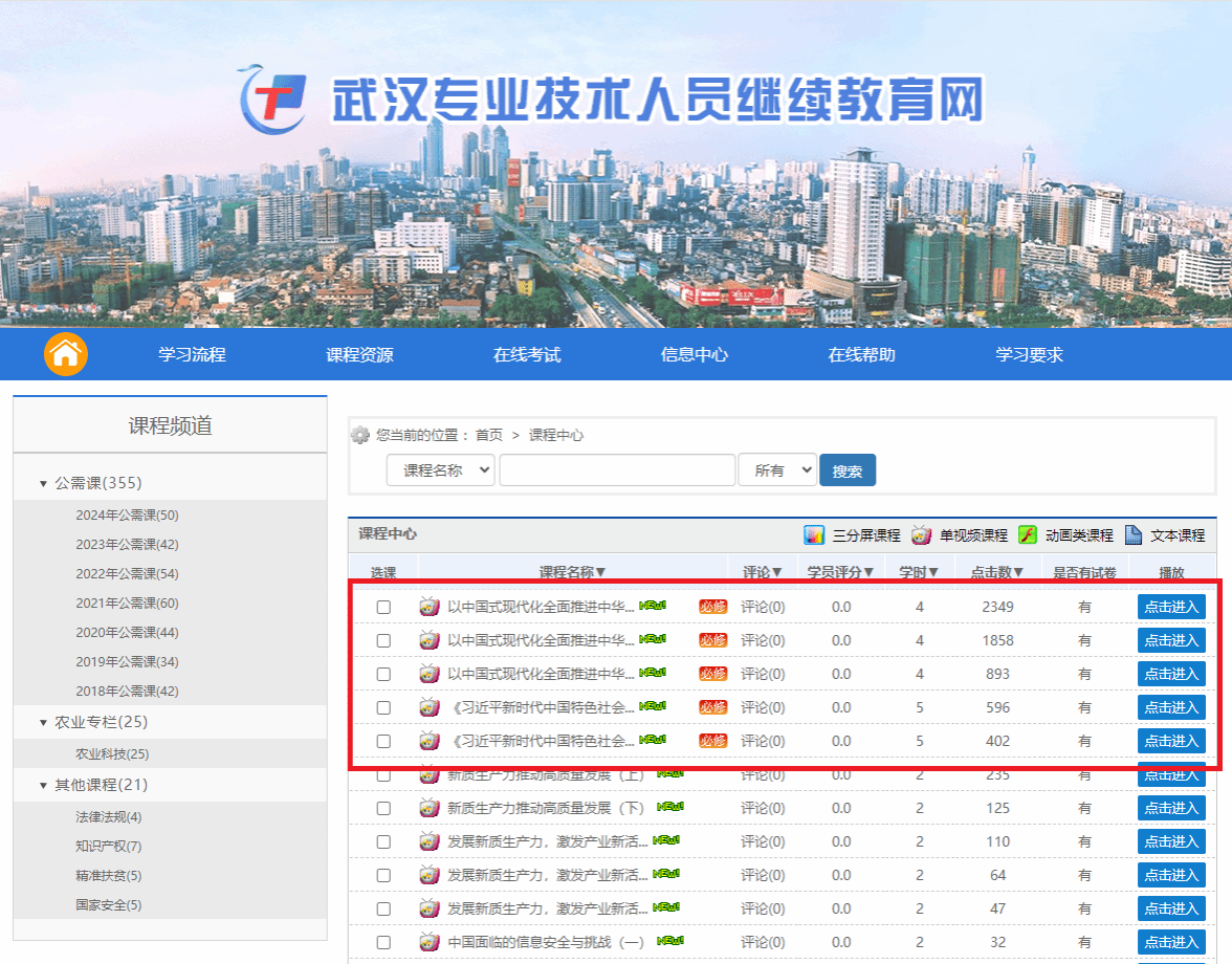 4.点击导航栏“课程资源”,即可显示武汉专业技术人员继续教育网各类课程资源(下图框出科目为2024年度公需课)。
