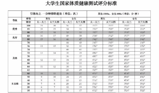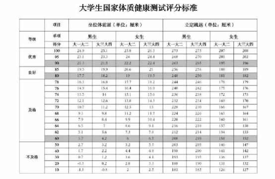 2025-2026学年体质健康测试严格参照《国家学生体质健康标准(2014年修订)》中大学生评分标准执行,各项目具体评分细则详见以下标准图片: