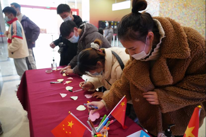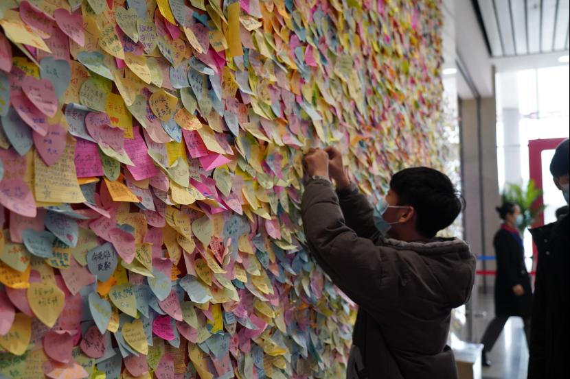 出馆时,看向满墙的爱心,观展师生都自发拿起笔,在纸条上写下自己对武汉的祝福、对逆行者们的感恩、对未来的美好愿景。