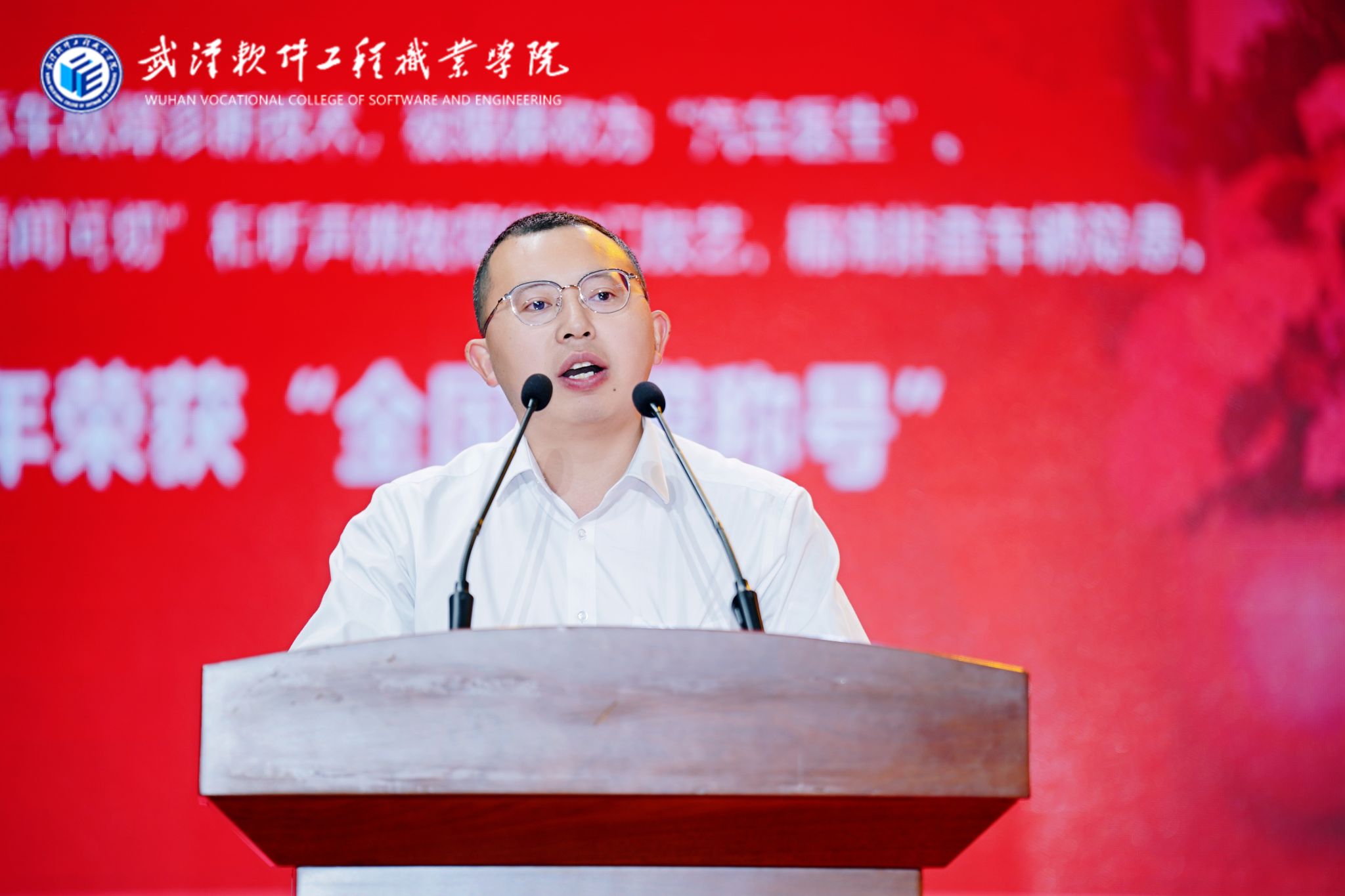 武汉软件工程职业学院机械工程学院数控技术专业2011届毕业生冯月兵作为校友代表发言。冯月兵是来自恩施大山的“山娃子”,在武软就读期间成绩优异,他不断以“工匠精神”激励自己,在老师们的支持下,不断打磨专业技能,毕业后成为武汉东风汽车集团东风乘用车制造总部的一名质量问题解析员,被同事称为“汽车医生”。2023年,冯月兵第一次走进人民大会堂,作为中国工会第十八次全国代表大会的代表发言,今年4月,他获得“全国劳动模范”荣誉。