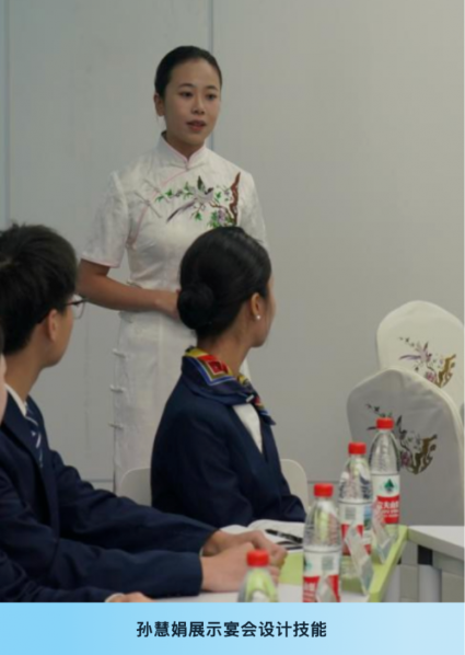 酒店2401班学生孙慧娟介绍,今年上半年,她先后参加郑州行业赛和2025年湖北省职业技能竞赛——中餐宴会比赛,两段比赛经历打磨着她的专业技能,也让她理解了“职业精神”这四个字的重量。“备赛期间,摆台有一系列严苛的标准:餐碟距桌边必须精准到1.5厘米,所有餐具间距要完全一致,要在15分钟内完成八人台的全套摆台。我曾三次不达标,急得想放弃,指导老师一直鼓励我,把任务拆解,陪着我逐个突破。我每天泡在实训室里,反复练习每一个动作的角度、力度和速度。一个多月后,我终于能又快又准地完成全套操作。两次备赛让我迅速成长:从前遇难题想放弃,现在会主动找方法;从前觉得严苛的标准是刁难,如今懂得这是对职业的敬畏、对专业的负责,要学会沉下心来打磨技能。这些藏在汗水里的经历,成为我未来就业最足的底气。”