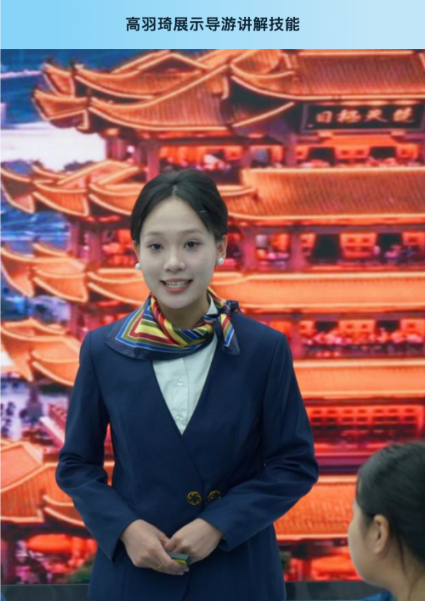酒店专业学生孙慧娟化身“宴会设计师”,凭借精巧的桌艺布局、创意的餐具搭配,将专业知识与审美素养融入每一处细节,呈现出一场兼具实用性与艺术性的宴会场景设计。旅游专业学生高羽琦则以“金牌导游”的自信,用流畅的语言、饱满的热情讲解黄鹤楼景点,从历史背景到文化内涵,从游览路线到服务贴士,尽显扎实的专业功底与良好的沟通能力。