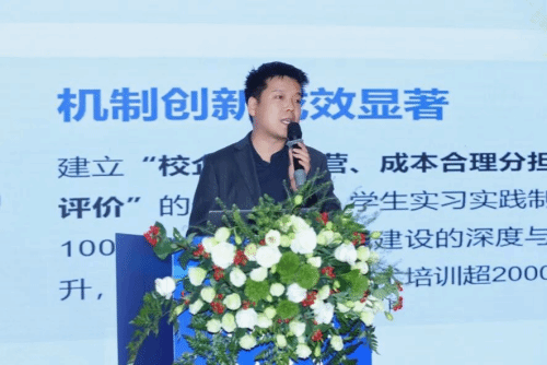 ▲美林数据技术股份有限公司副总裁、全国工业大数据行业产教融合共同体秘书长肖西伟作“企业生产性实践基地建设探索与实践”主题报告