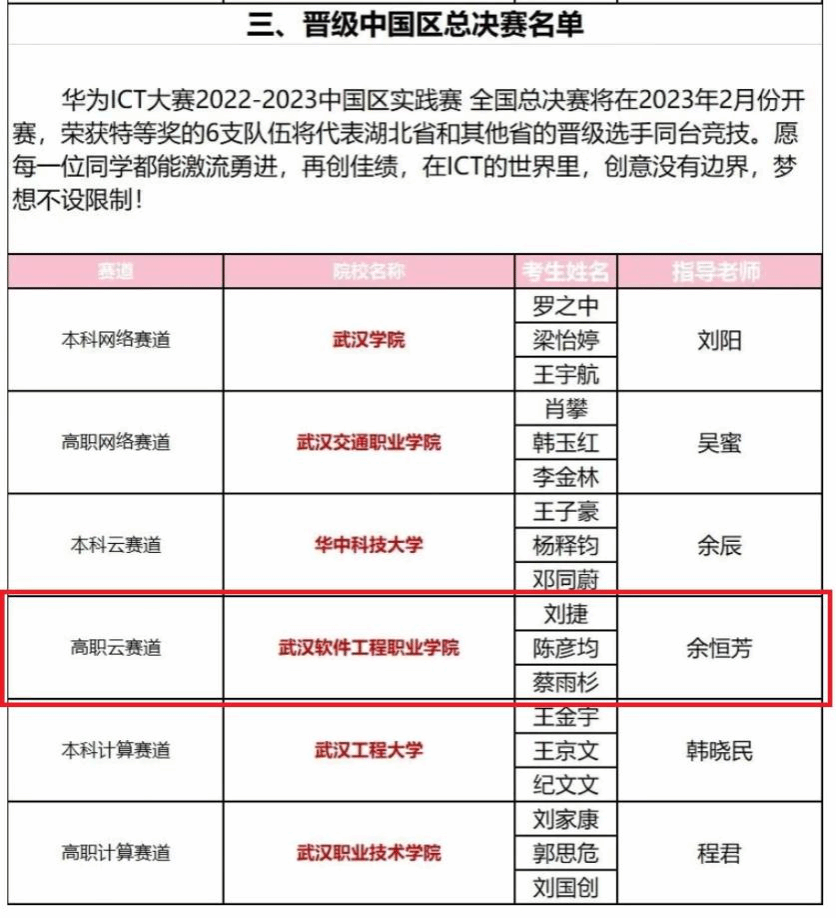 近日,在华为ICT大赛2022-2023中国区湖北省实践赛决赛中,我校计算机学院云计算技术应用专业余恒芳老师指导的刘捷、陈彦均、蔡雨杉获得云赛道特等奖,将代表湖北省参加全国总决赛。