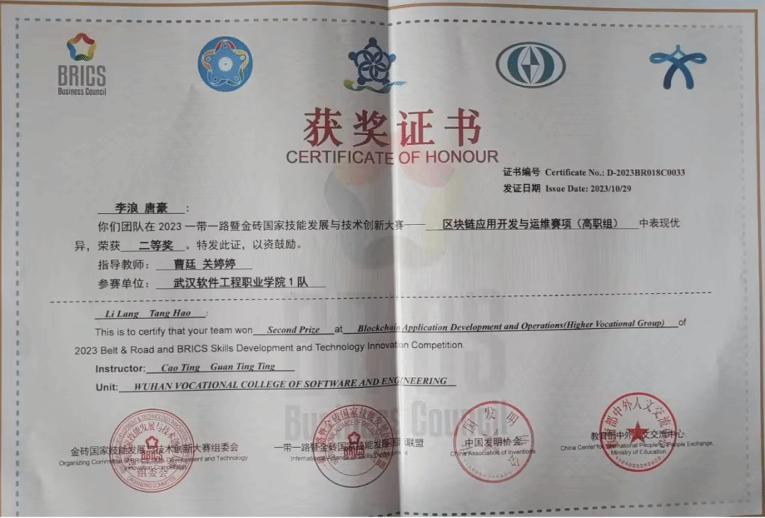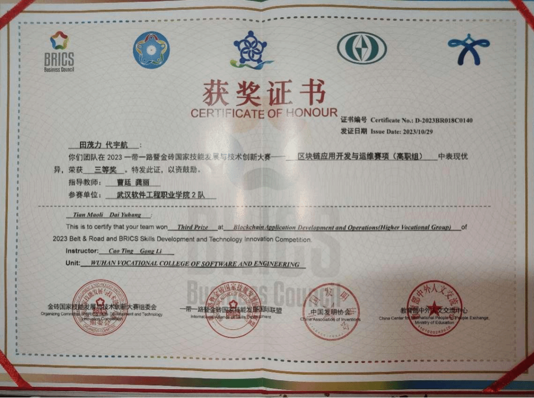 计算机学院曹廷、关婷婷老师指导的李浪、唐豪团队,在“区块链应用开发与运维”赛项中,荣获二等奖,曹廷、龚丽老师指导的移动互联代宇航、田茂力团队荣获全国三等奖;龚丽老师指导的段家煚,在“移动跨平台开发”赛项中获三等奖。