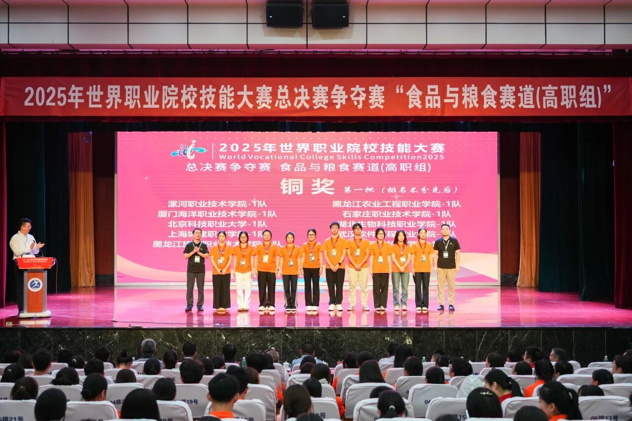 在食品与粮食赛道,生命健康学院食品检验检测技术专业的张雯雯、车博颖、徐航、熊贵荣四名同学,在林敏、熊海燕教师的悉心指导下摘得铜牌,为荣誉榜再添亮色。备赛期间,师生放弃暑假休息,将“精准”与“坚持”刻进每一个训练细节:他们深入调研食品行业痛点,把“解决实际问题”转化为赛场技能:从样品前处理的规范操作,到仪器分析的精密把控,再到数据报告的逻辑梳理,每一个步骤都反复打磨、每一次协作都力求顺畅。校领导多次来到训练现场,为师生加油鼓劲,也针对技术细节手把手指导,用“零距离”支持为备赛扫清障碍——这枚铜牌,是对“精益求精”职业精神的致敬。