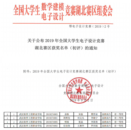 (通讯员 卢贶)近期,全国大学生电子设计竞赛湖北赛区竞赛结果公布,我校电子工程学院5支参赛队喜获湖北省一等奖3项、二等奖1项。