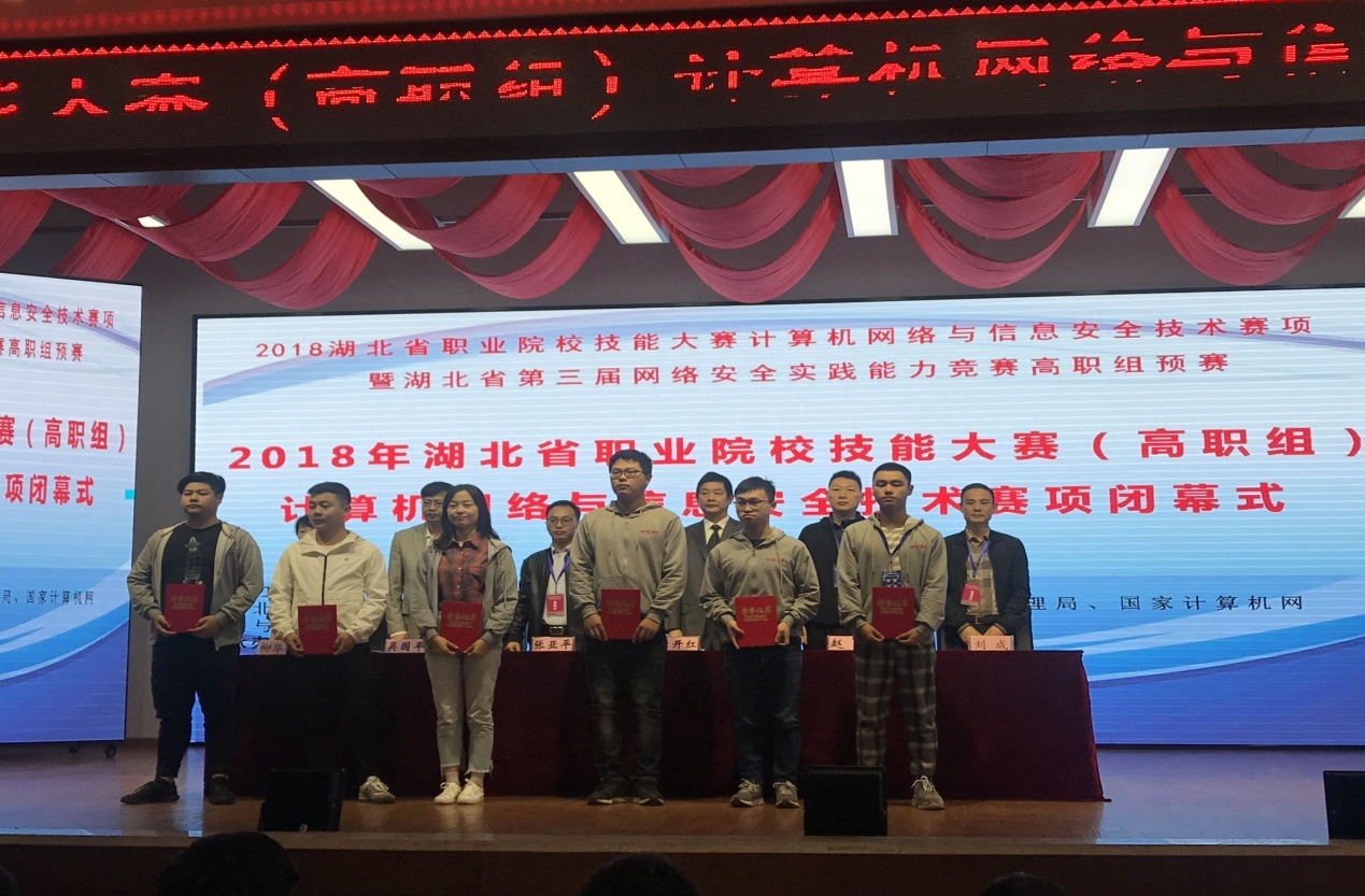 (通讯员 刘媛媛)10月28日,在湖北生物科技职业学院,2018年湖北省职业院校技能大赛(高职组)计算机网络与信息安全赛项落下帷幕。我校计算机学院刘新宇、侯冰楠、魏孝忠三名同学组成的推荐队和王子豪、杜智慧、郭自然三名同学组成的抽测队均获得一等奖。