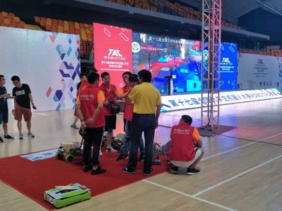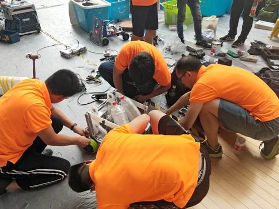 由于场馆空调不能使用,老师和同学们冒着36度以上的酷暑高温,在没空调也没电扇的体育馆备赛区改装、调试、比赛整整两天半。大家只有集中在一起讨论比赛策略时才有机会围在冰块旁边“烤冰”凉快一下。同学们衣服湿透了也没时间换,常常是湿了干,干了又湿。为了能为校争光赢得比赛,没有一个同学叫苦叫累。李乘行、汪盛杰、王应欢等同学虽然上场比赛机会较少,但他们对团队的每个机器人了如指掌,在比赛过程中积极协助队友完成各项工作。电子工程学院党总支胡英书记、校团委卢海燕、团总支吕璟书记为大家送水送饭做好后勤服务工作。邓峰老师常常趴在被太阳晒得发热的地板上帮同学们检修设备,确保上场时万无一失。每间寝室都成了战队的临时实验室,每天晚上邓峰老师和队员们改装、调试到深夜,就连吃饭睡觉都和同学们形影不离,同学们亲切地称呼他“峰哥”。江中华老师睿智冷静,有多年的大赛指导经验,休息时他顶着高温在二楼观众席分析各个对手的优劣势,不时到一楼候场区和队员们沟通进攻防守策略,比赛时他总能用各种策略给对手致命一击。