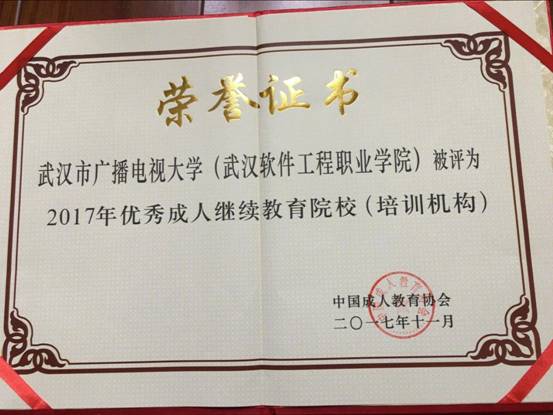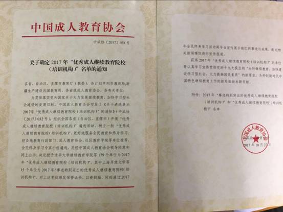 近日,中国成人教育协会发布了《关于确定2017年“优秀成人继续教育院校(培训机构)”名单的通知》,我校榜上有名,获评 “优秀成人继续教育院校(培训机构)”称号。该评选旨在全国遴选展示一批为全民终身学习服务成绩突出的成人继续教育院校和培训机构。