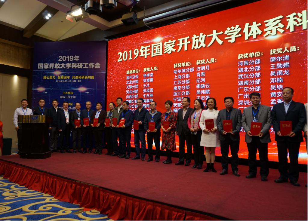 12月5-6日,2019年国家开放大学教学科研工作会在海南省海口市举行。国家开放大学党委书记、校长荆德刚,国家开放大学副校长鞠传进、杨孝堂出席会议,各开放大学(广播电视大学)党委书记、校长,以及国家开放大学办学体系的中高层管理者近300人参加了会议。我校马蜂书记、孙美华副校长带队参加会议,会上,我校环化学院吴雨龙教授、余磊博士分别被授予“科研贡献奖”、“青年学术新秀”荣誉,我校党委书记马蜂教授应邀为“科研贡献奖”颁奖。