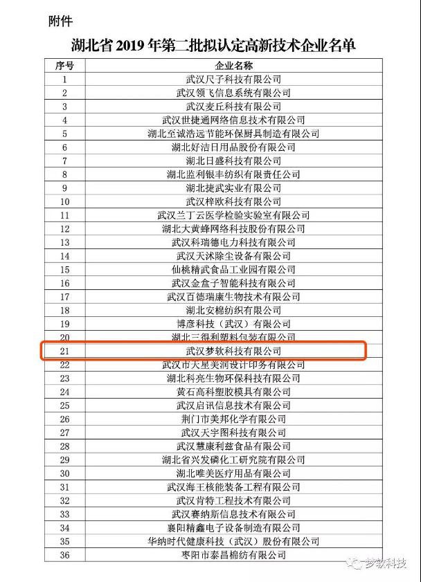 近日,在2019年湖北省第二批高新技术企业认定中,我校众创空间孵化企业“武汉梦软科技有限公司”被国家科技部火炬高新技术产业开发中心认定为“国家级高新技术企业”,这也是我校孵化企业首次获此殊荣。