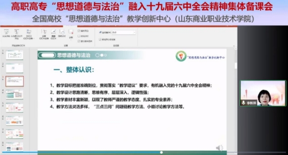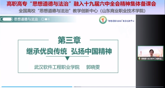 郭晓雯老师进行了“思想道德与法治”课程“第三章 融入党的十九届六中全会精神”的教学建议及整体教学设计介绍。她根据课程教学内容和《党的十九届六中全会精神融入“思想道德与法治”课的教学建议》,从整体教学设计、教学模式、教学内容三个方面展开说课,在教学设计上充分体现“问题链”模式特色与职业教育特色。例如在讲授改革创新精神时,她设置了系列问题“中国北斗覆盖全球,意味着什么?”“结合专业,你还知道哪些大国重器实现了核心技术自主化?”“作为高职院校大学生,如何做改革创新生力军?”