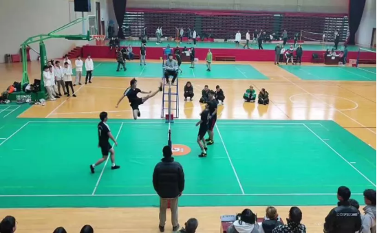 男双决赛 (左边我校运动员起跳踏球进攻)