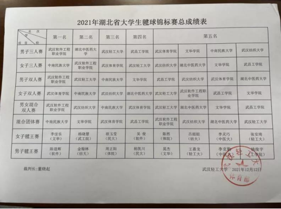 12月11日-12日举行的2021年湖北省大学生毽球比赛中,我校毽球校队荣获男团冠军、男双冠军、混双冠军、男子毽王冠军、女团亚军,实现男子团体五连冠。