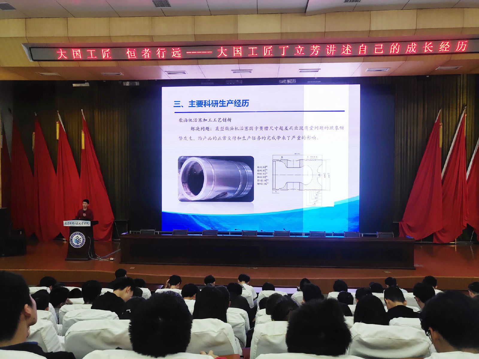 丁老师从个人经历讲起,2000年他对车工进行钻研,2004年历经磨练的他破格晋升为高级技工,2009年被评为技师,2012年被评为高级技师,2017年被中船重工集团聘为高级技能专家。他说:“成功是需要积淀,不是一蹴而就,我们大学生要沉下心来搞专业、搞学习”。他还为我们讲解了柴油机的创新工艺,以及现在最重视的人才培养模式,传递了工匠精神的敬业、精益、专注、创新,并激励广大青年学生珍惜现在的学习时光,不断充实和完善自我。
