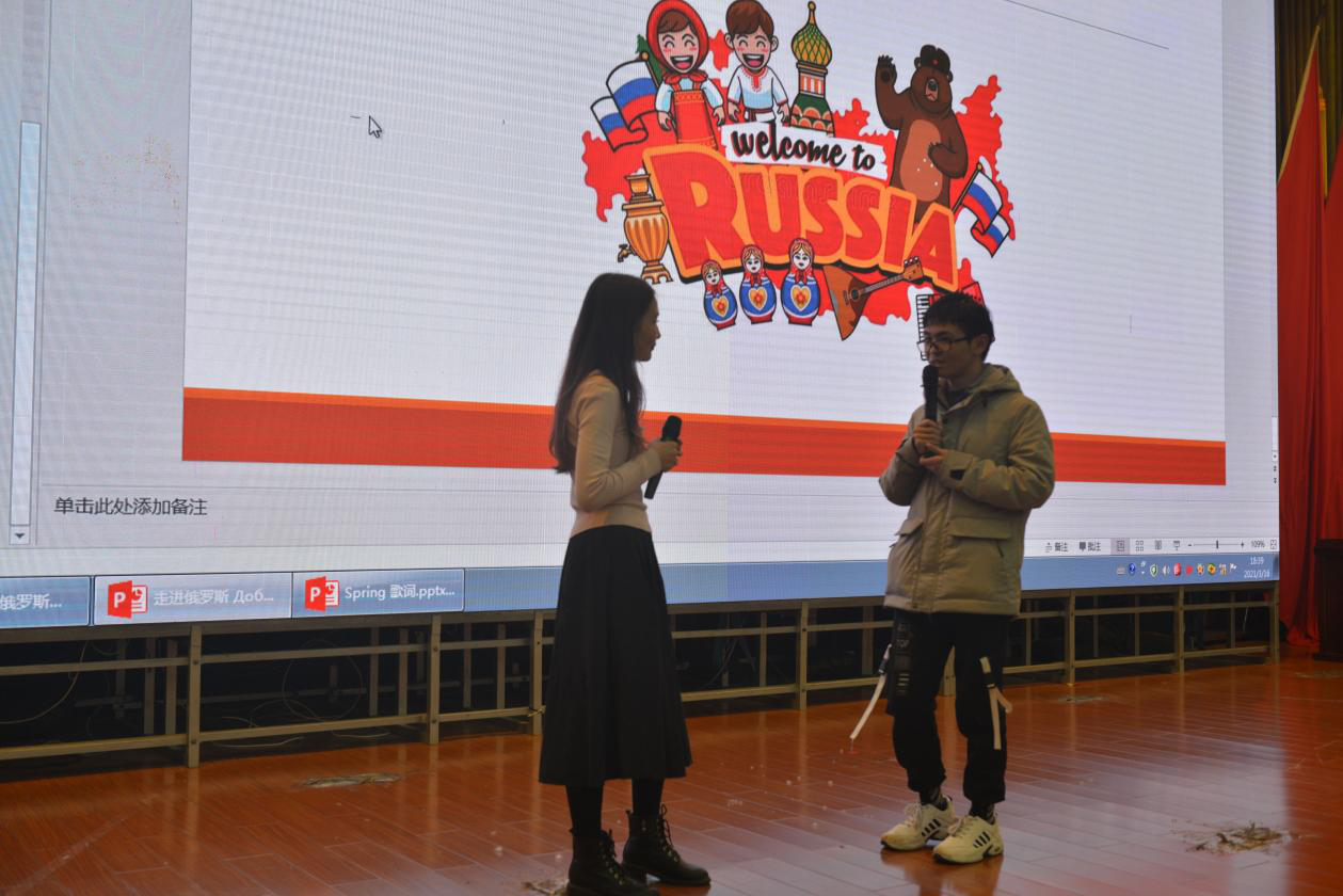 清新妙曼的俄文歌曲《春天》拉开了活动序幕。曾任武汉汉欧国际物流有限公司市场营销部副部长、俄罗斯籍Fedorova Sabina/Федорова Сабина女士围绕俄罗斯的气候、饮食、建筑、文学,娓娓道来,引领师生邂逅俄罗斯文化,领略异国风情。