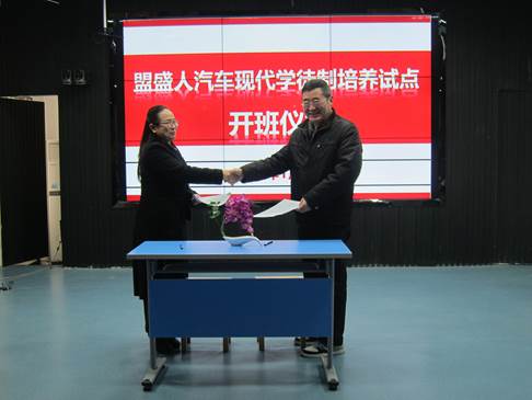 (通讯员吕美强)1月4日,在汽车营销策划实训室,汽车工程学院“盟盛人现代学徒制班”正式开班,校企双方签订合作协议书。在与会师生和企业代表的见证下,18级汽车检测与维修专业25名学生从此拥有“大学生”和“小学徒”的双重ID,将在学校老师和企业师傅的教育带领下实现。