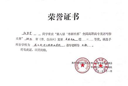 在刚刚结束的第八届“外研社杯”全国高职高专英语写作(湖北省赛区)大赛中,我校商学院商务英语专业敖翌雯同学获得一等奖。