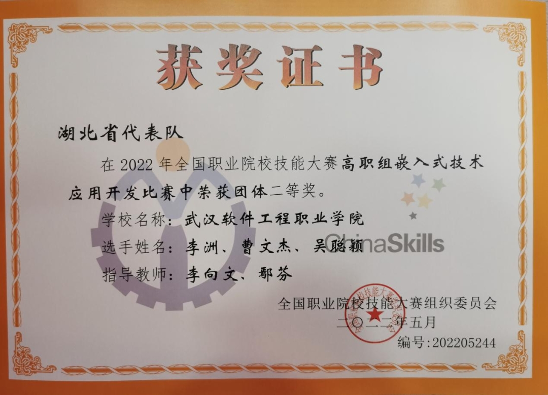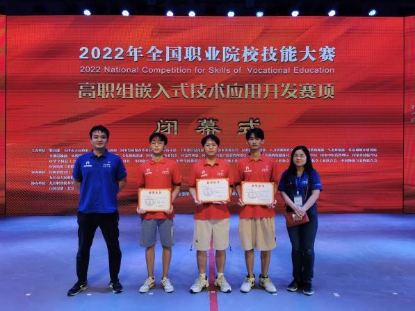 8月29日至31日,2022年全国职业院校技能大赛(高职组)“嵌入式技术应用开发”赛项在九江职业技术学院举行,赛项重点考察电路设计、微控制器技术、感知技术、自动识别技术、总线接口技术、嵌入式无线通信与互联技术、移动应用软件开发、视觉及语音识别技术、人工智能与边缘计算技术等嵌入式技术核心知识和技能。最终,计算机学院物联网应用技术专业李洲、曹文杰、吴聪颖团队获二等奖。
