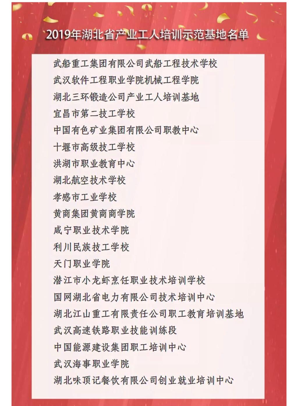 (通讯员 陈帆)近日,湖北省总工会发布“关于命名2019年湖北省产业工人培训示范基地和职工(劳模、工匠)创新工作室的决定”,我校机械工程学院成功入选“湖北省产业工人培训示范基地”,成为20个示范基地之一。