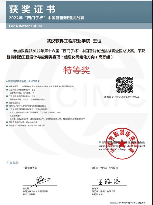 (通讯员:陈元凯)9月29日,在2022年第十六届“西门子杯”中国智能制造挑战赛全国总决赛中,我校电子工程学院工业互联网专业学生徐王恒、贺志豪组成的“云英”参赛队,从全国600多支队伍中脱颖而出,以第一名的成绩获得“信息化网络化赛项”高职组特等奖,捧回象征着中国智能制造挑战赛最高荣誉的“西门子杯”。指导老师陈元凯、卢高洁获得“优秀指导教师”称号。这也是继2019年夺冠后,我校学子第二次获得该赛项全国总冠军。