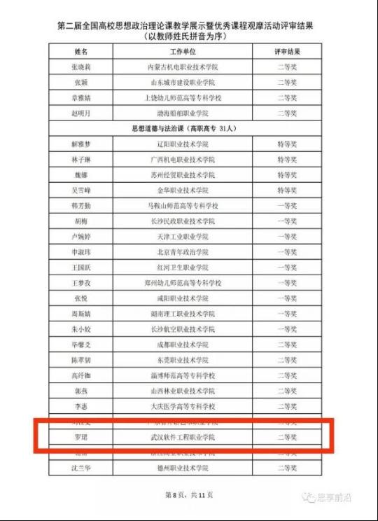本届全国高校思想政治理论课教学展示暨优秀课程观摩活动于今年5月启动,全国高校近11万名思政课教师参与,课程涵盖高职高专、本科、研究生的10门思政课必修课,共591份作品经过层层选拔入围国赛,最终275份作品获奖。本次湖北省遴选22位高校思政课教师参赛,共7人获奖,分别来自武汉大学、华中师范大学、中国地质大学(武汉)、中南民族大学、武汉科技大学、武汉纺织大学和武汉软件工程职业学院。青年教师罗珺是湖北省高职院校的唯一获奖者。