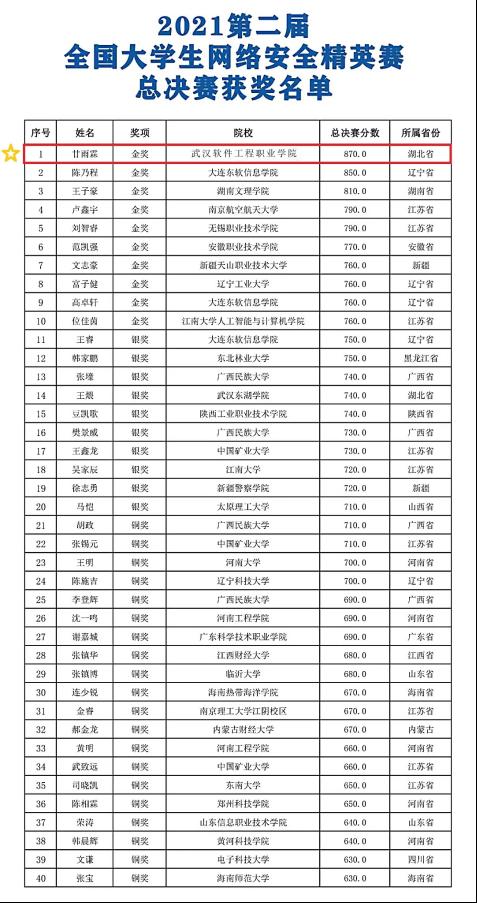 11月1日晚,我校计算机学院信息安全与管理专业大三学生甘雨霖惊喜得知,他拿下了2021第二届全国大学生网络安全精英赛第一名。和他同台竞技的,是全国2768所高校的30000余名参赛大学生,其中不乏来自电子科技大学、南京航空航天大学等名校的本科生。
