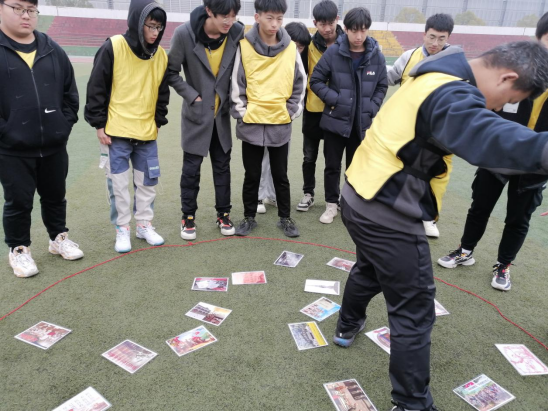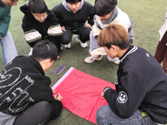 8:30,同学们在田径场集合,迅速分成“红”“黄”“蓝”“绿”四个小队,在队长带领下以自我介绍的形式开营破冰。团队成员共同用中俄文设计了队名“我爱中国”“звезда(星星)”“товарищ(同学)”“конь(战马)”,大家一起绘制队旗,制订口号,选择造型,
