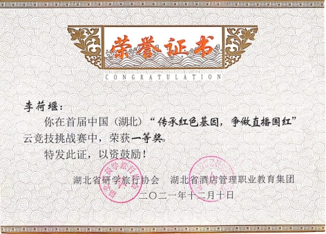 经过层层选拔,首届中国(湖北)“传承红色基因,争做直播国红”云竞技挑战大赛总成绩于近日揭晓,我校旅游管理2019级学生李荷堰荣获一等奖。