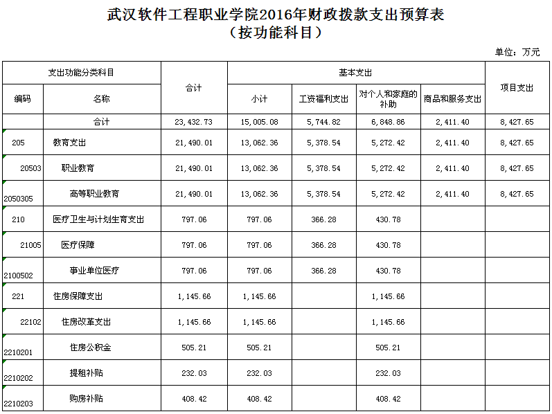 武汉软件工程职业学院2016年财政拨款支出预算表(按功能科目)