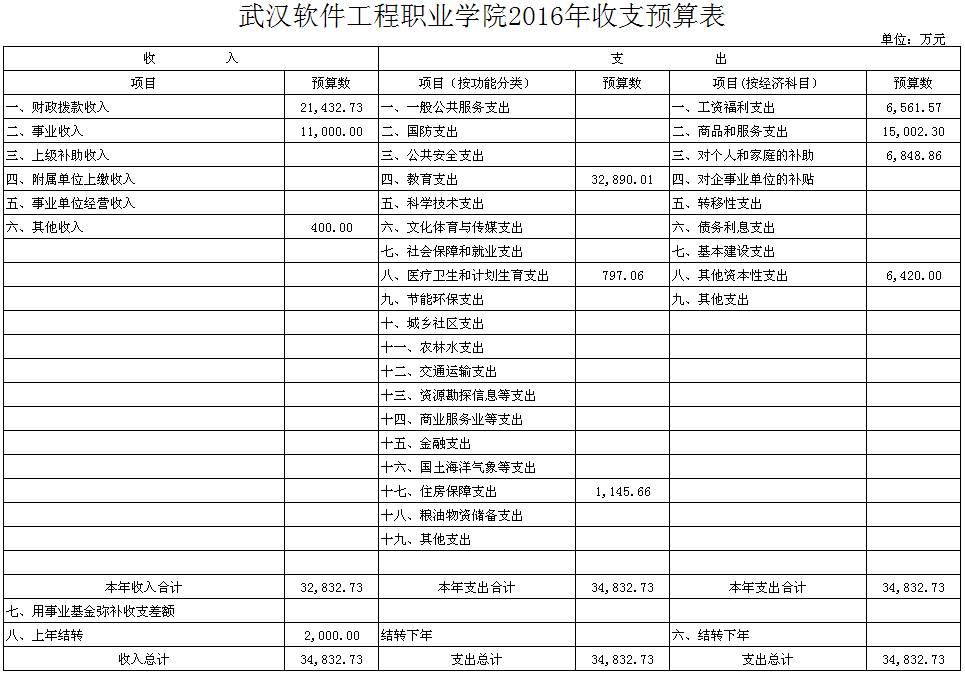 武汉软件工程职业学院2016年财政拨款支出预算表(按功能科目)